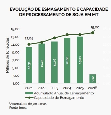 Em 2026, a capacidade de processamento das indústrias no estado totalizou 15 milhões de toneladas de soja, volume 3,20% superior ao registrado no ano anterior, segundo relatório do Imea, instituto Mato-grossense de economia agropecuária. Essa expansão reflete a demanda aquecida pelos coprodutos da soja, que vem apresentando crescimento desde o início do ano. Como resultado, em mar/26, as indústrias esmagadoras do estado processaram 1,23 milhão de toneladas, volume 10,79% superior ao registrado em fev/26 e o maior já observado para o mês em toda a série histórica.